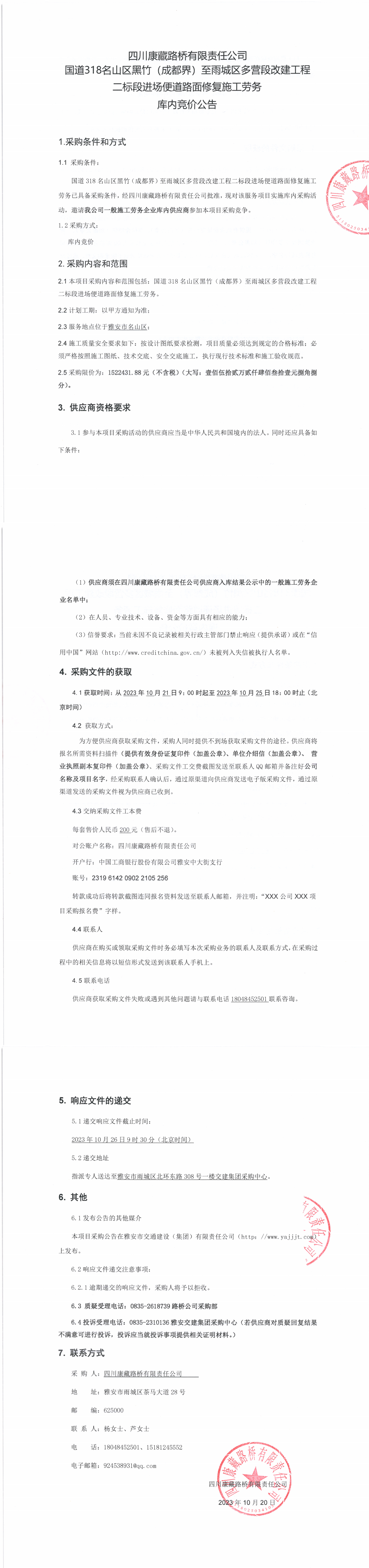 四川康藏路橋有限責任公司國道318名山區(qū)黑竹(成都界)至雨城區(qū)多營段改建工程二標段進場便道路面修復施工勞務庫內(nèi)競價公告