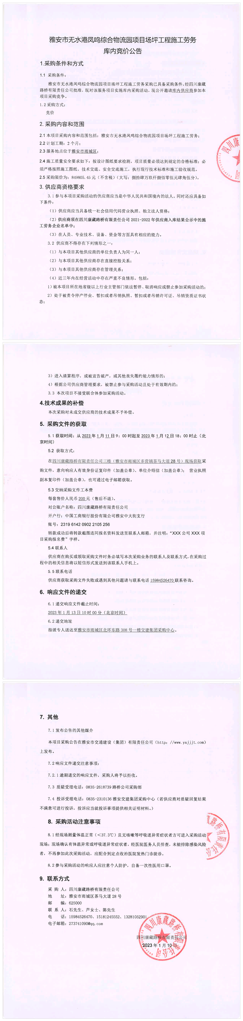 四川康藏路橋有限責任公司雅安市無水港鳳鳴綜合物流園項目場坪工程施工勞務庫內競價公告