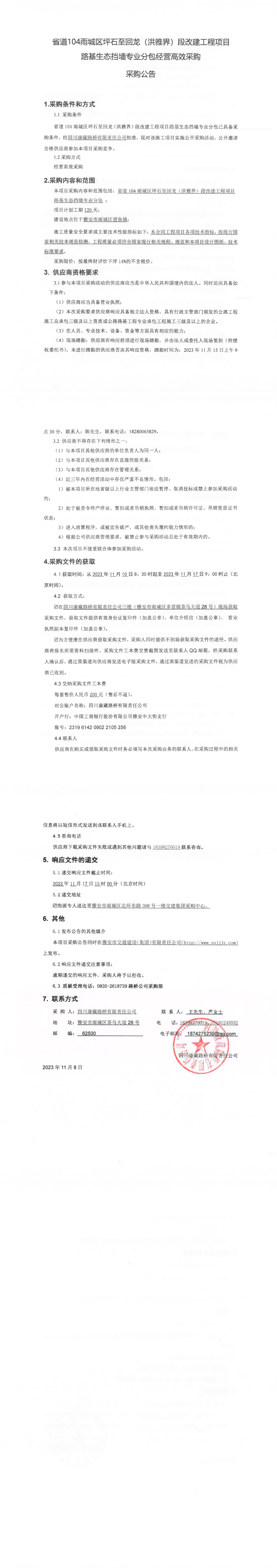 四川康藏路橋有限責(zé)任公司省道104雨城區(qū)坪石至回龍(洪雅界)段改建工程項(xiàng)目路基生態(tài)擋墻專業(yè)分包經(jīng)營(yíng)高效采購公告