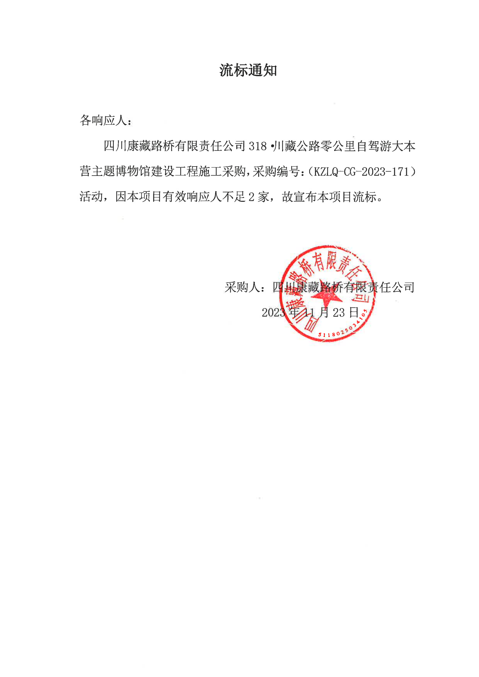 四川康藏路橋有限責(zé)任公司318·川藏公路零公里自駕游大本營(yíng)主題博物館建設(shè)工程施工采購(gòu)流標(biāo)通知