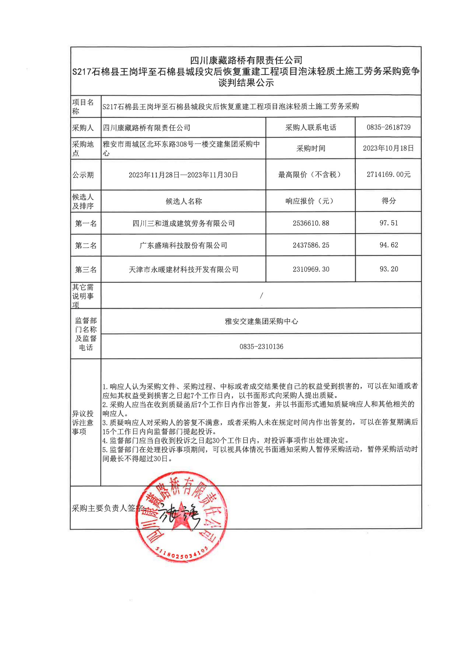 四川康藏路橋有限責(zé)任公司S217石棉縣王崗坪至石棉縣城段災(zāi)后恢復(fù)重建工程項目泡沫輕質(zhì)土施工勞務(wù)采購結(jié)果公示