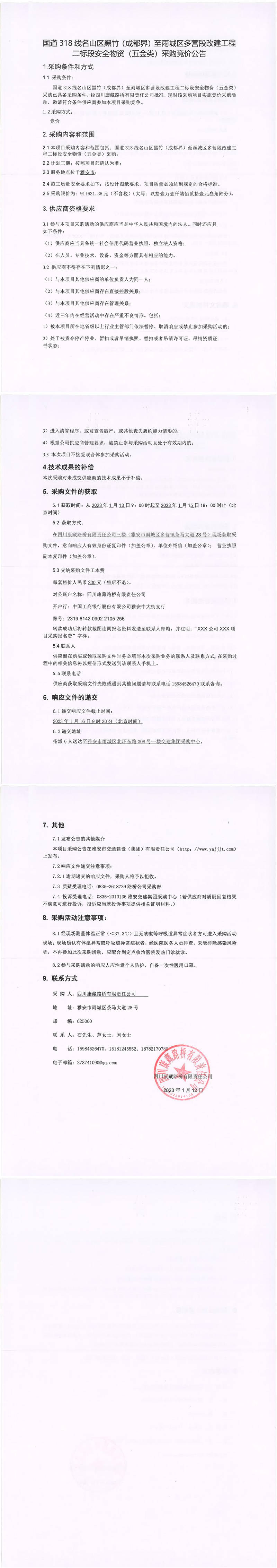 四川康藏路橋有限責(zé)任公司國(guó)道318線名山區(qū)黑竹(成都界)至雨城區(qū)多營(yíng)段改建工程二標(biāo)段安全物資(廣告類(lèi))采購(gòu)競(jìng)價(jià)公告