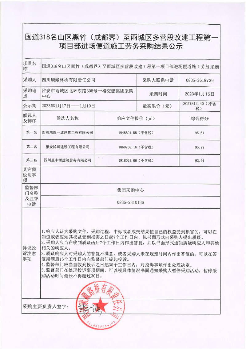 四川康藏路橋有限責任公司國道318名山區(qū)黑竹(成都界)至雨城區(qū)多營段改建工程第一項目部進場便道施工勞務采購結果公示