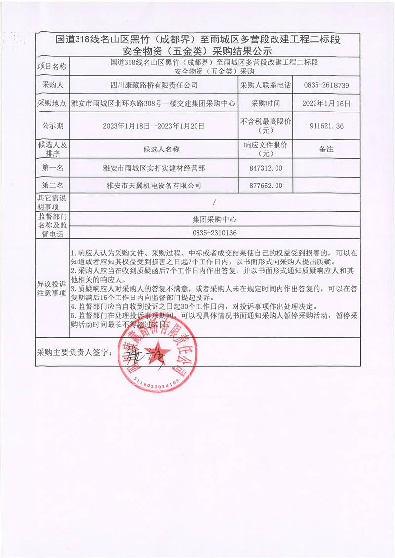 四川康藏路橋有限責(zé)任公司國(guó)道318線名山區(qū)黑竹(成都界)至雨城區(qū)多營(yíng)段改建工程二標(biāo)段安全物資(五金類(lèi))采購(gòu)結(jié)果公示