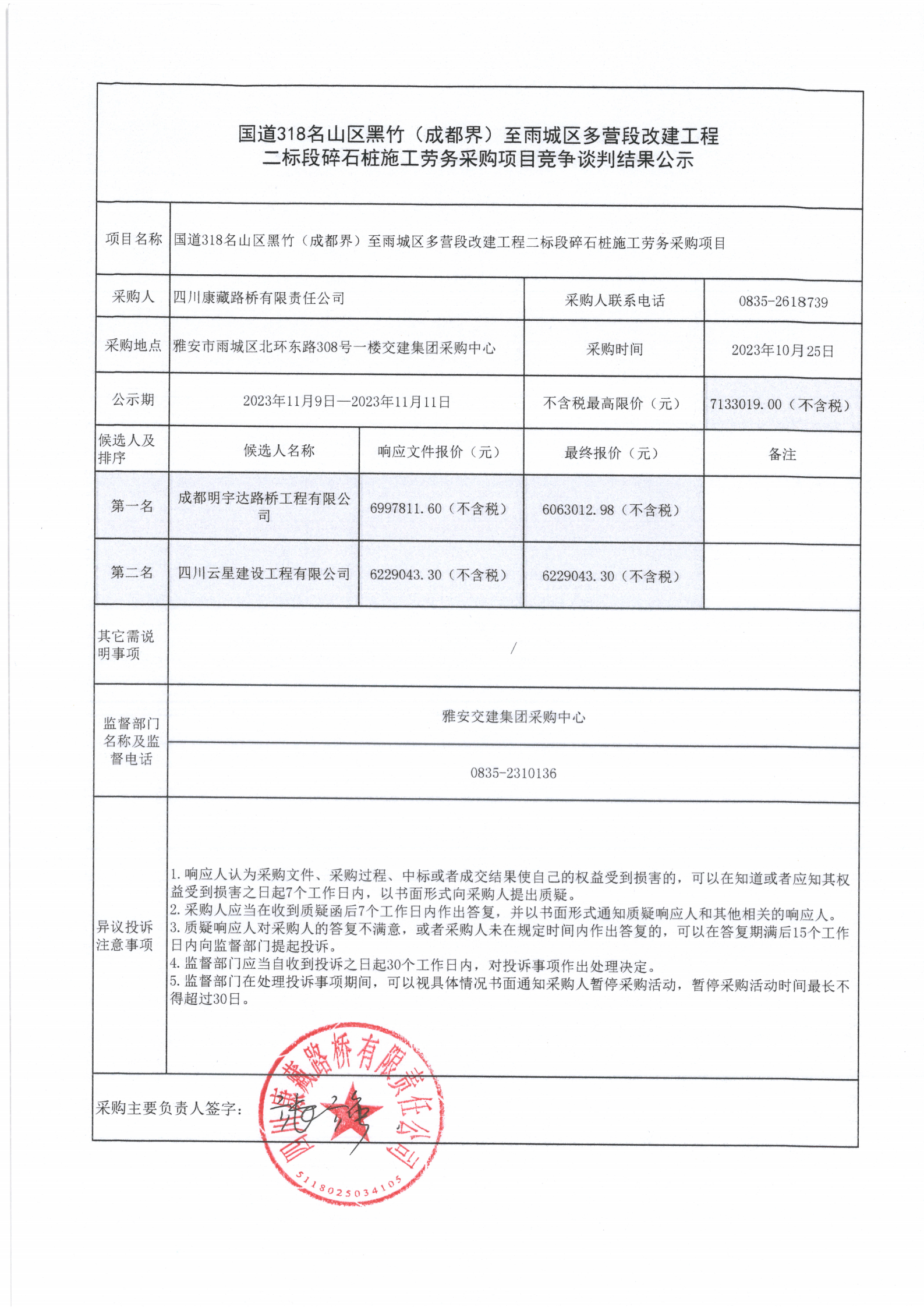 四川康藏路橋有限責任公司國道318名山區(qū)黑竹(成都界)至雨城區(qū)多營段改建工程二標段碎石樁施工勞務采購項目競爭談判結(jié)果公示