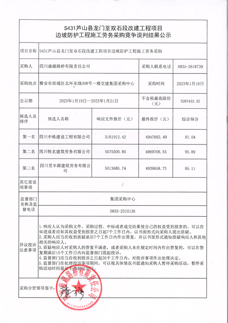 四川康藏路橋有限責(zé)任公司S431蘆山縣龍門(mén)至雙石段改建工程項(xiàng)目邊坡防護(hù)工程施工勞務(wù)采購(gòu)競(jìng)爭(zhēng)談判結(jié)果公示