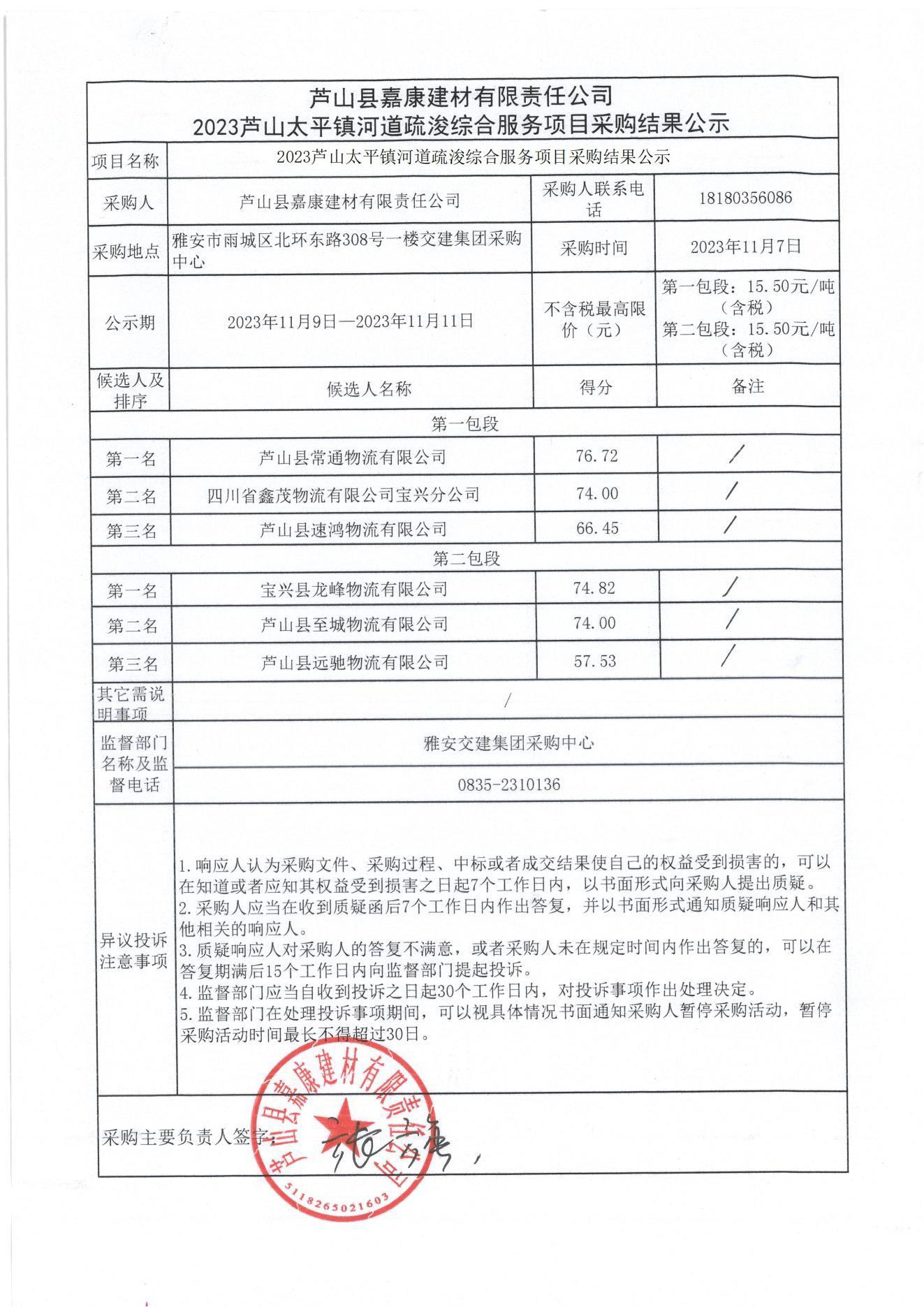 蘆山縣嘉康建材有限責(zé)任公司2023蘆山太平鎮(zhèn)河道疏浚綜合項(xiàng)目采購結(jié)果公示