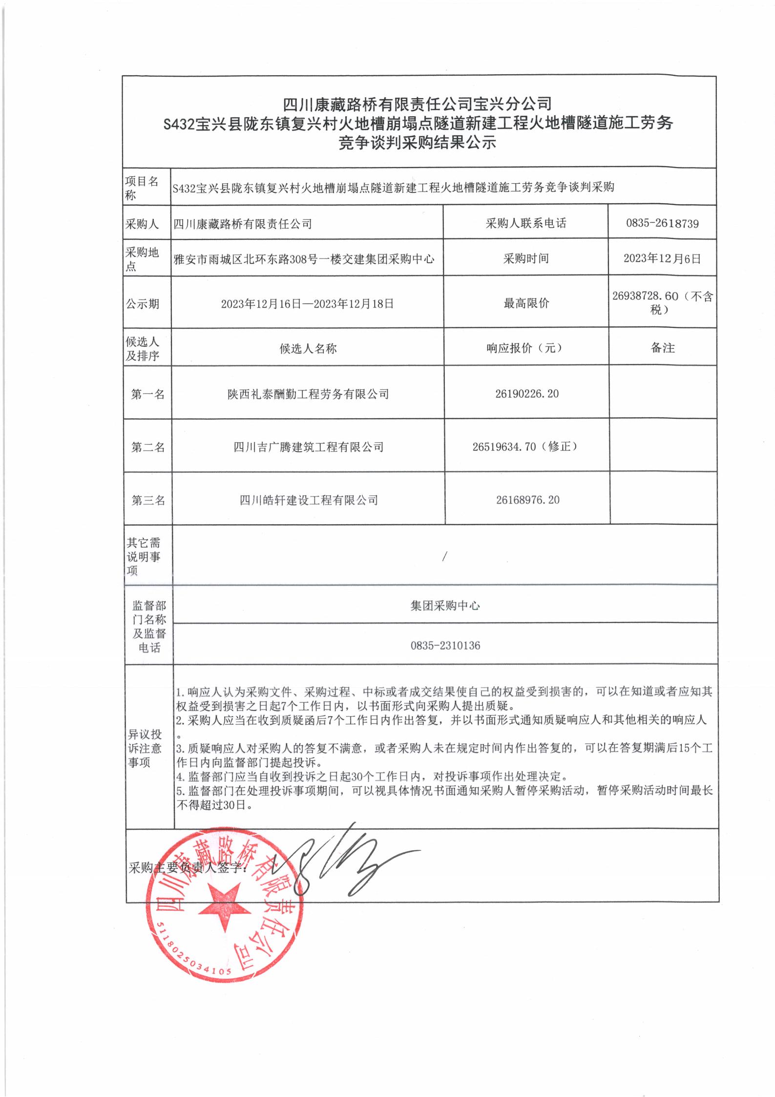 四川康藏路橋有限責(zé)任公司寶興分公司S432寶興縣隴東鎮(zhèn)復(fù)興村火地槽崩塌點(diǎn)隧道新建工程火地槽隧道施工勞務(wù)競(jìng)爭(zhēng)談判采購結(jié)果公示