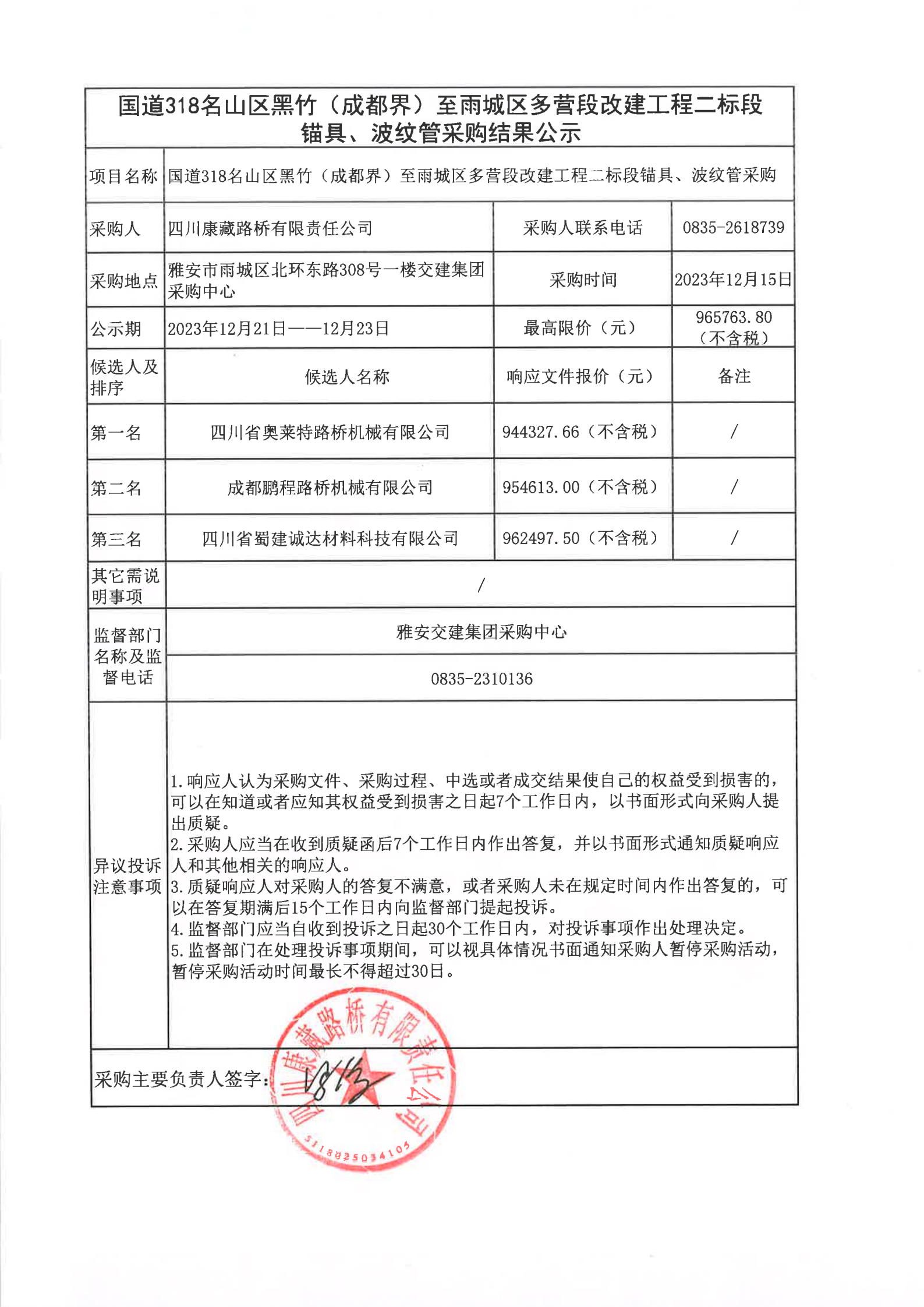 四川康藏路橋有限責(zé)任公司國(guó)道318名山區(qū)黑竹(成都界)至雨城區(qū)多營(yíng)段改建工程二標(biāo)段錨具、波紋管采購(gòu)結(jié)果公示