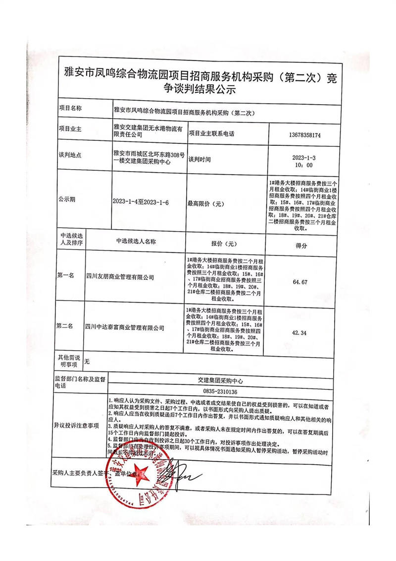 雅安交建集團無水港物流有限責(zé)任公司雅安市鳳鳴綜合物流園項目招商服務(wù)機構(gòu)采購(第二次)競爭談判結(jié)果公示
