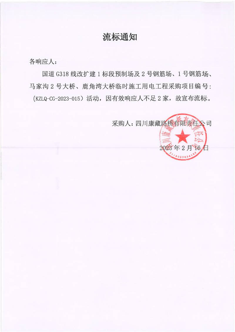 四川康藏路橋有限責任公司國道G318線改擴建1標段預制場及2號鋼筋場、1號鋼筋場、馬家溝2號大橋、鹿角灣大橋臨時施工用電工程采購項目流標通知