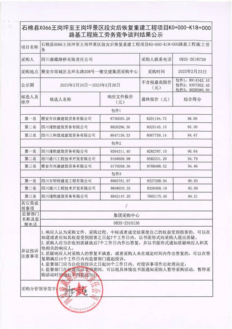四川康藏路橋有限責任公司石棉縣X066王崗坪至王崗坪景區(qū)段災后恢復重建工程項目K0+000-K18+000路基工程施工勞務競爭談判結(jié)果公示