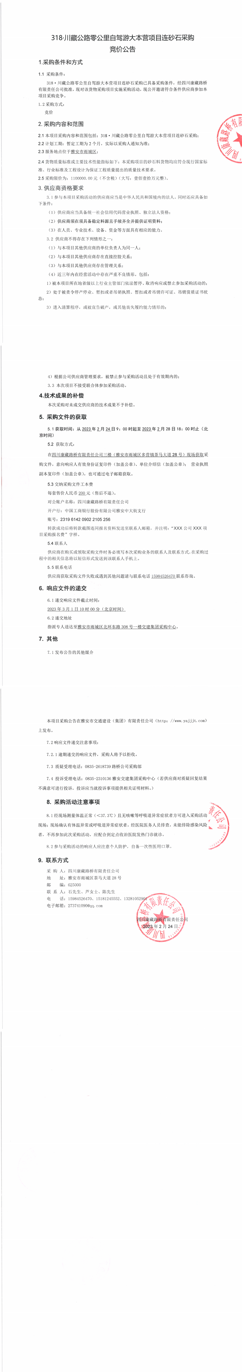四川康藏路橋有限責任公司318·川藏公路零公里自駕游大本營項目連砂石采購競價公告