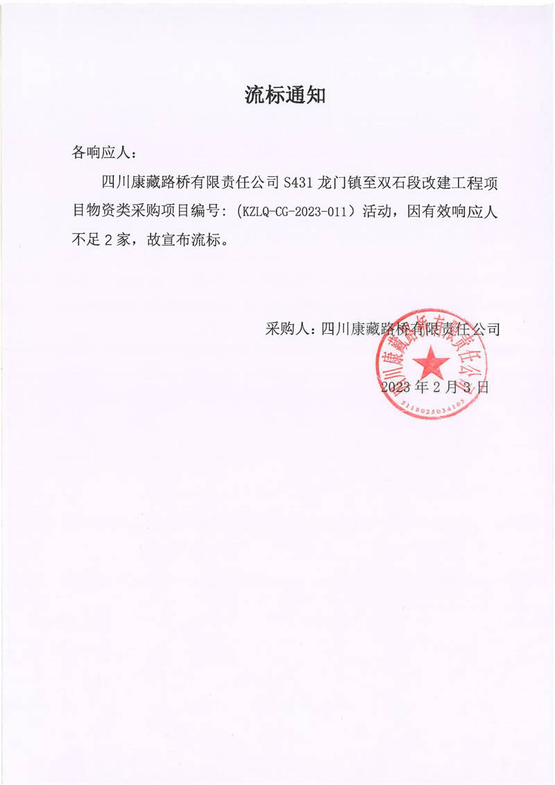 四川康藏路橋有限責(zé)任公司S431龍門鎮(zhèn)至雙石段改建工程項(xiàng)目物資類采購(gòu)流標(biāo)通知