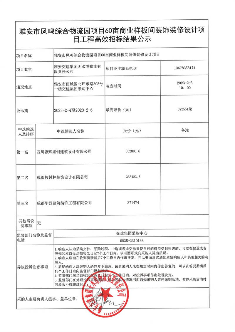 雅安交建集團無水港物流有限責(zé)任公司雅安市鳳鳴綜合物流園項目60畝商業(yè)樣板間裝飾裝修設(shè)計項目工程高效采購結(jié)果公示