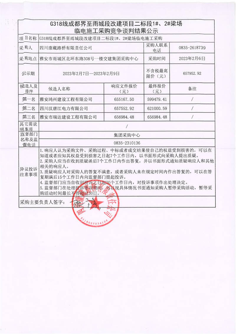 四川康藏路橋有限責(zé)任公司G318線成都界至雨城段改建項(xiàng)目二標(biāo)段1#、2#梁場(chǎng)臨電施工采購(gòu)競(jìng)爭(zhēng)談判結(jié)果公示