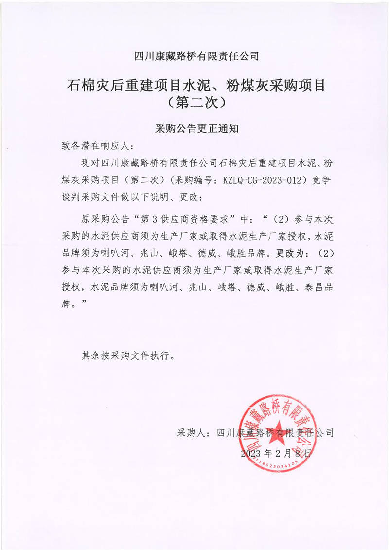 四川康藏路橋有限責(zé)任公司石棉災(zāi)后重建項目水泥、粉煤灰采購項目(第二次)采購公告更正通知