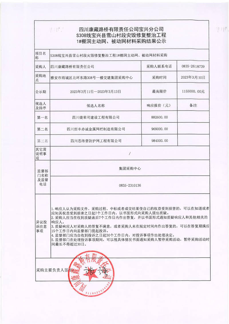 四川康藏路橋有限責(zé)任公司寶興分公司S308線寶興縣雪山村段災(zāi)毀修復(fù)整治工程1#棚洞主動(dòng)網(wǎng)、被動(dòng)網(wǎng)材料采購(gòu)結(jié)果公示