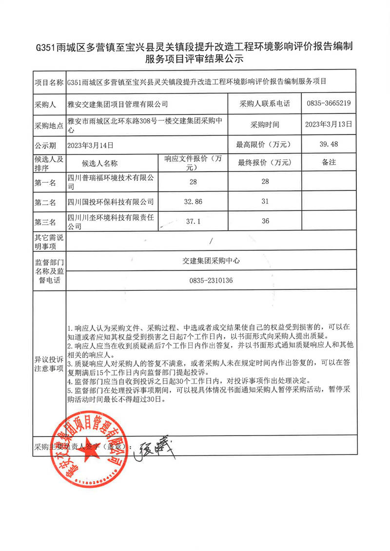 雅安交建集團(tuán)項(xiàng)目管理有限公司G351雨城區(qū)多營鎮(zhèn)至寶興縣靈關(guān)鎮(zhèn)段提升改造工程環(huán)境影響評價報告編制服務(wù)項(xiàng)目結(jié)果公示