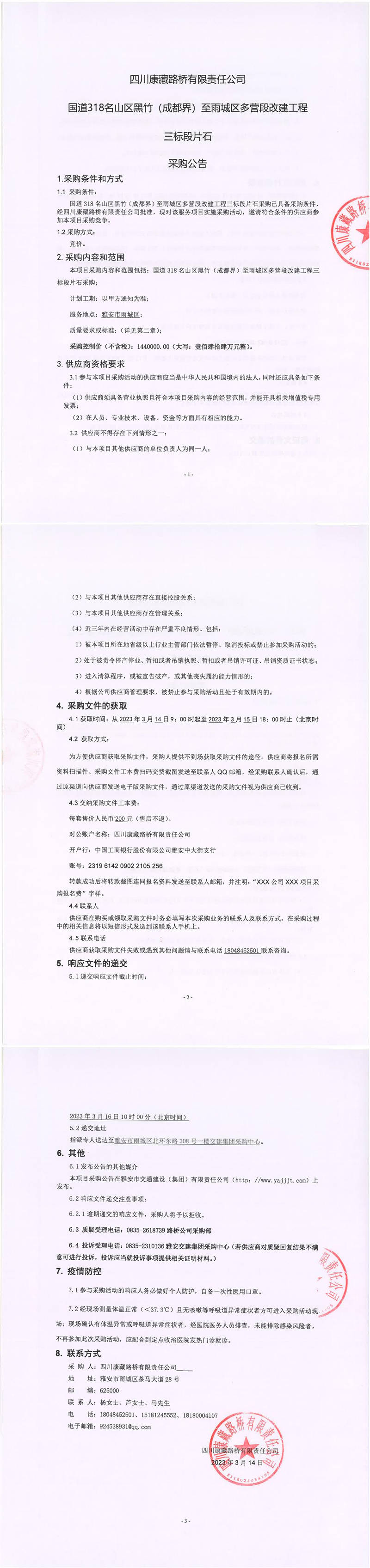 四川康藏路橋有限責任公司國道318名山區(qū)黑竹(成都界)至雨城區(qū)多營段改建工程三標段片石采購公告