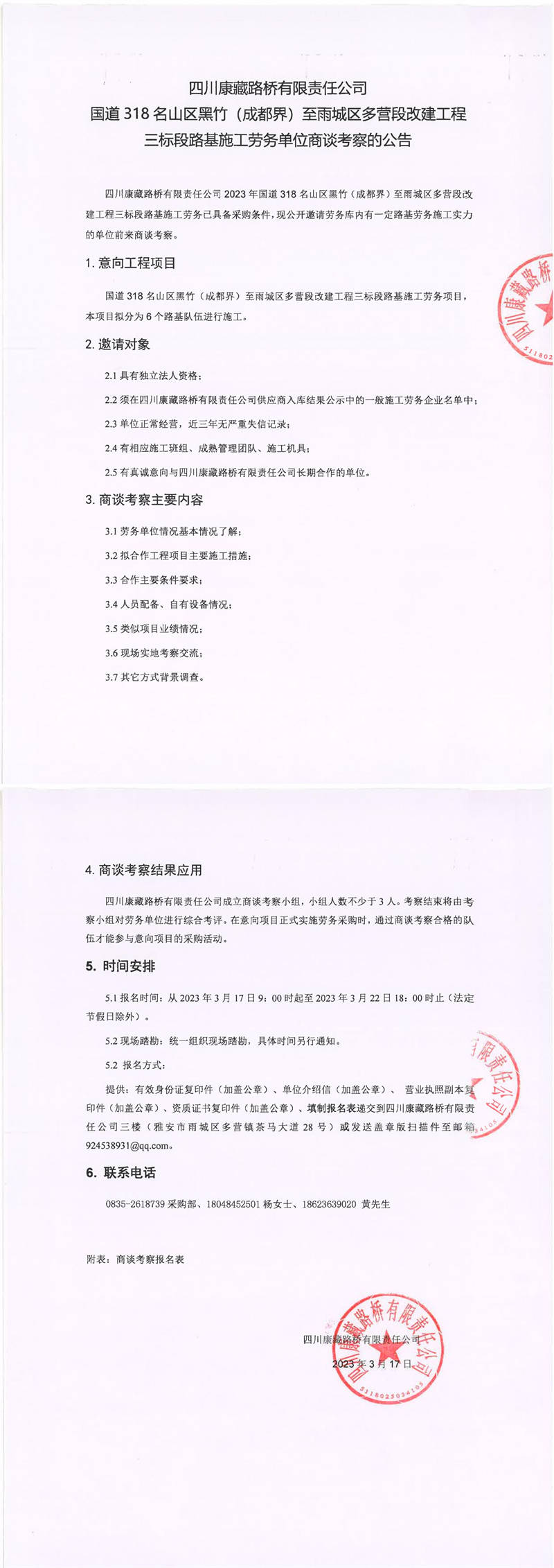 四川康藏路橋有限責(zé)任公司國道318名山區(qū)黑竹(成都界)至雨城區(qū)多營段改建工程三標(biāo)段路基施工勞務(wù)單位商談考察的公告