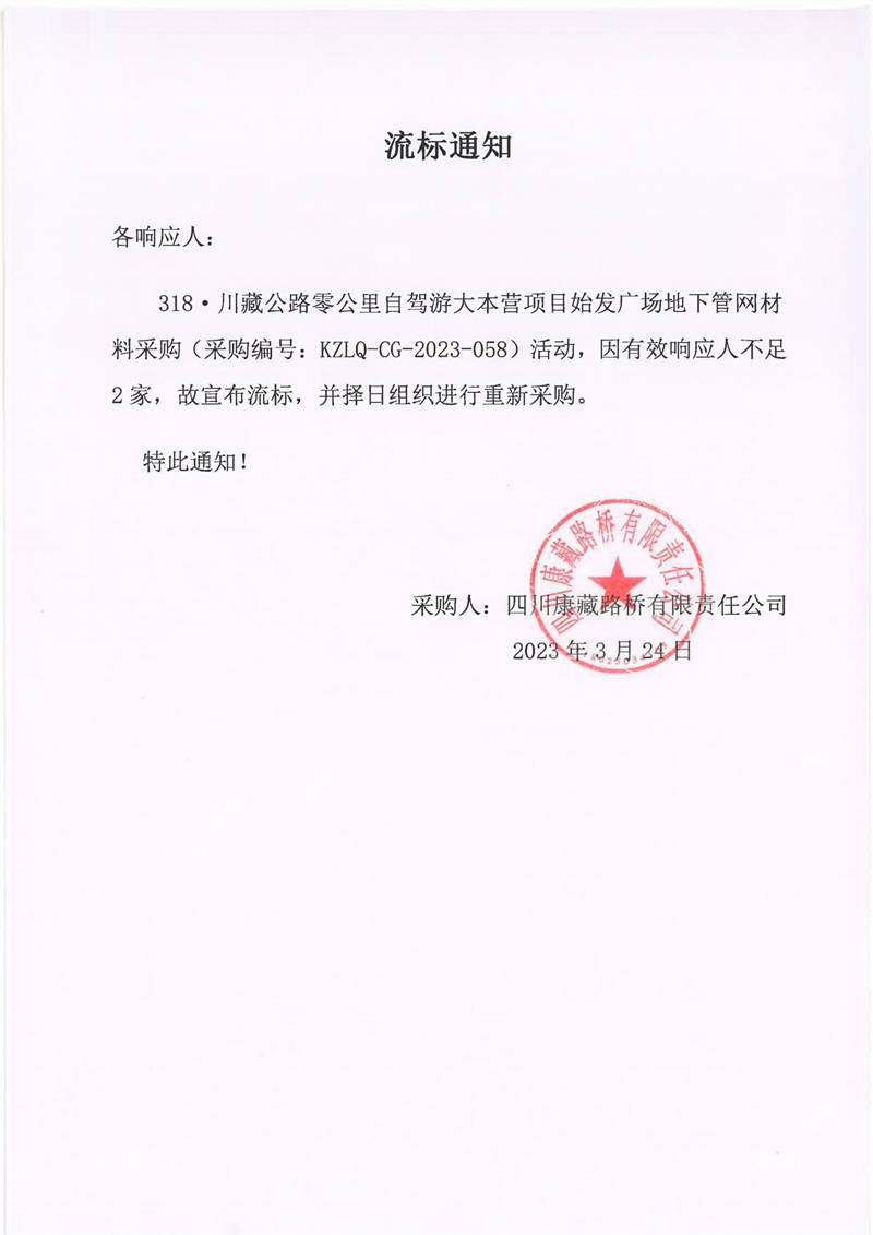 四川康藏路橋有限責(zé)任公司318·川藏公路零公里自駕游大本營(yíng)項(xiàng)目始發(fā)廣場(chǎng)地下管網(wǎng)材料采購流標(biāo)通知