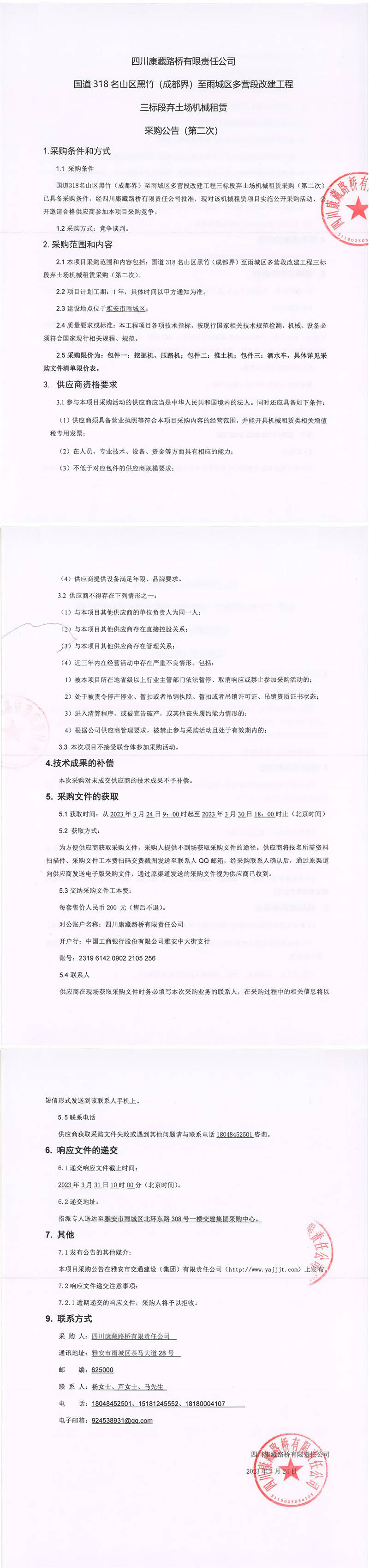 四川康藏路橋有限責(zé)任公司國(guó)道318名山區(qū)黑竹(成都界)至雨城區(qū)多營(yíng)段改建工程三標(biāo)段棄土場(chǎng)機(jī)械租賃采購(gòu)公告(第二次)