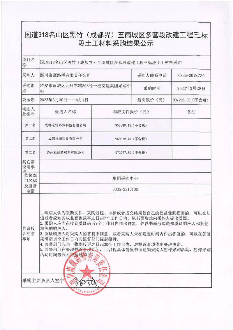 四川康藏路橋有限責(zé)任公司國(guó)道318名山區(qū)黑竹(成都界)至雨城區(qū)多營(yíng)段改建工程三標(biāo)段土工材料采購(gòu)結(jié)果公示