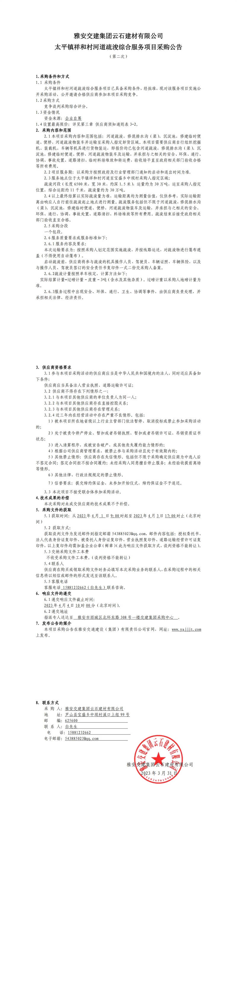 雅安交建集團(tuán)云石建材有限公司太平鎮(zhèn)祥和村河道疏浚綜合服務(wù)項(xiàng)目采購公告(第二次)