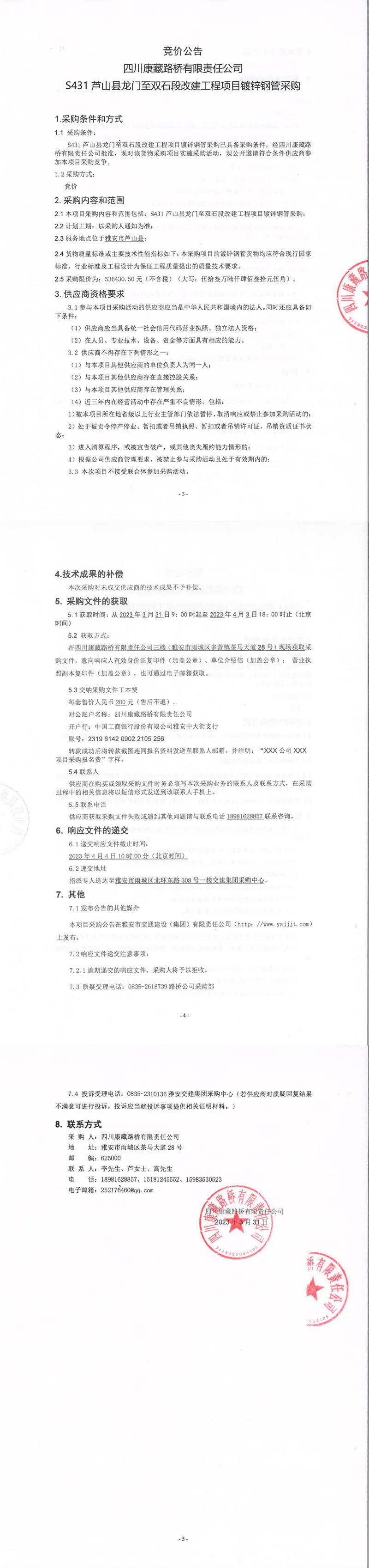 四川康藏路橋有限責(zé)任公司S431蘆山縣龍門至雙石段改建工程項(xiàng)目鍍鋅鋼管采購競價(jià)公告