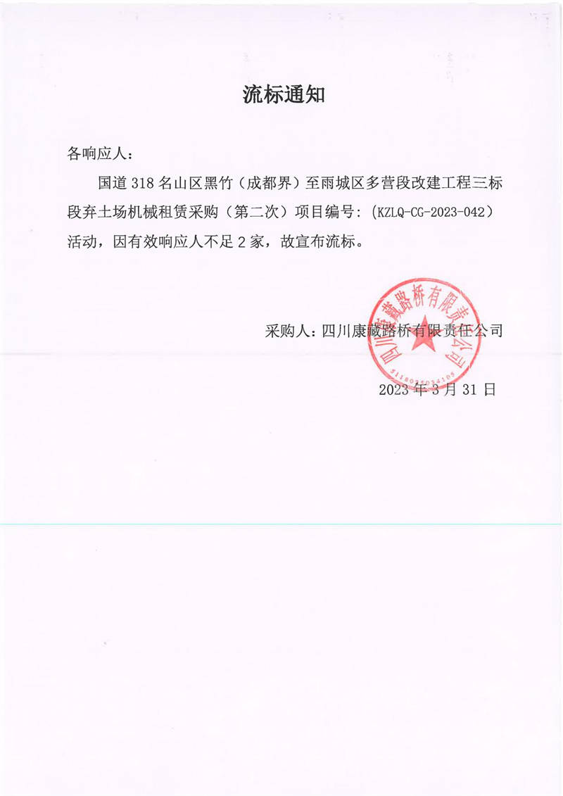 四川康藏路橋有限責任公司國道318名山區(qū)黑竹(成都界)至雨城區(qū)多營段改建工程三標段棄土場機械租賃采購流標通知