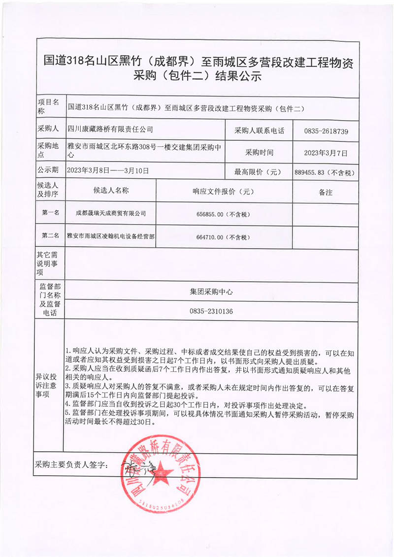 四川康藏路橋有限責任公司國道318名山區(qū)黑竹(成都界)至雨城區(qū)多營段改建工程物資采購(包件二)結果公示