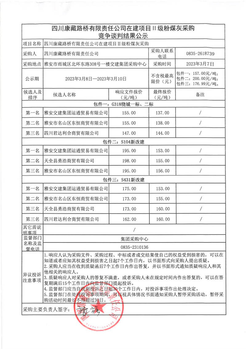 四川康藏路橋有限責(zé)任公司在建項(xiàng)目II級(jí)粉煤灰采購競爭談判結(jié)果公示