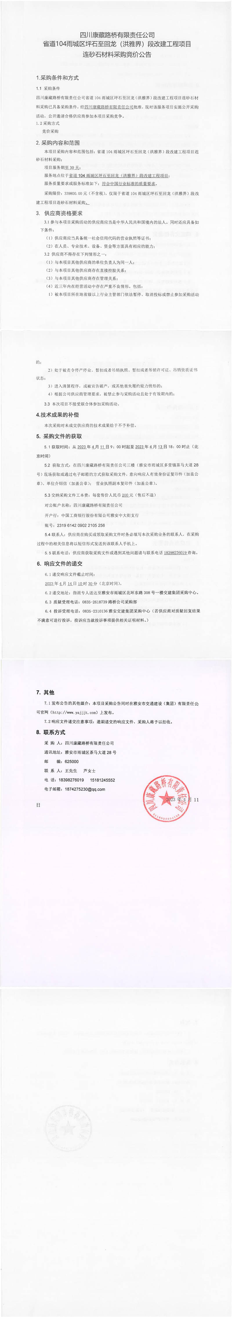 四川康藏路橋有限責(zé)任公司省道104雨城區(qū)坪石至回龍(洪雅界)段改建工程項(xiàng)目連砂石材料采購競價(jià)公告