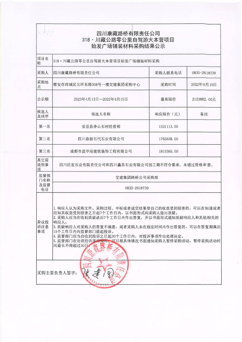 四川康藏路橋有限責(zé)任公司318·川藏公路零公里自駕游大本營項目始發(fā)廣場鋪裝材料采購結(jié)果公示