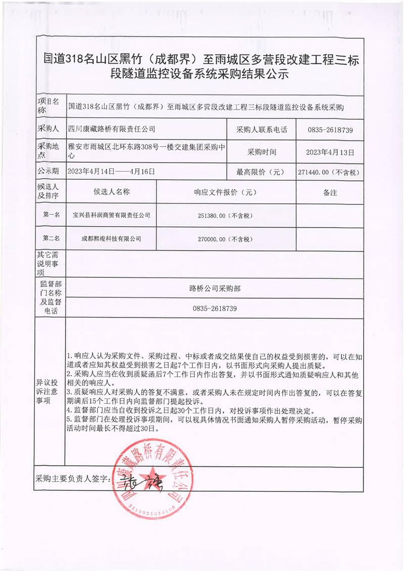 四川康藏路橋有限責(zé)任公司國道318名山區(qū)黑竹(成都界)至雨城區(qū)多營段改建工程三標(biāo)段隧道監(jiān)控設(shè)備系統(tǒng)采購結(jié)果公示