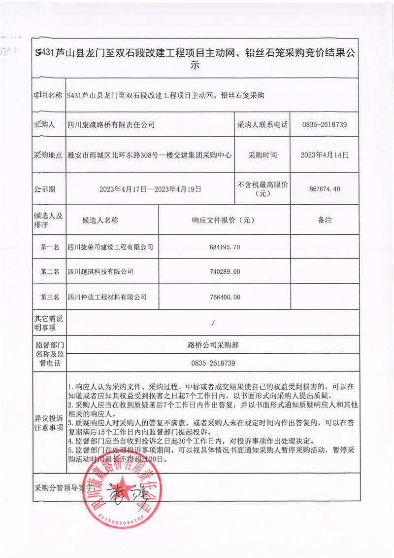 四川康藏路橋有限責(zé)任公司S431蘆山縣龍門至雙石段改建工程項(xiàng)目主動(dòng)網(wǎng)、鉛絲石籠采購(gòu)競(jìng)價(jià)結(jié)果公示