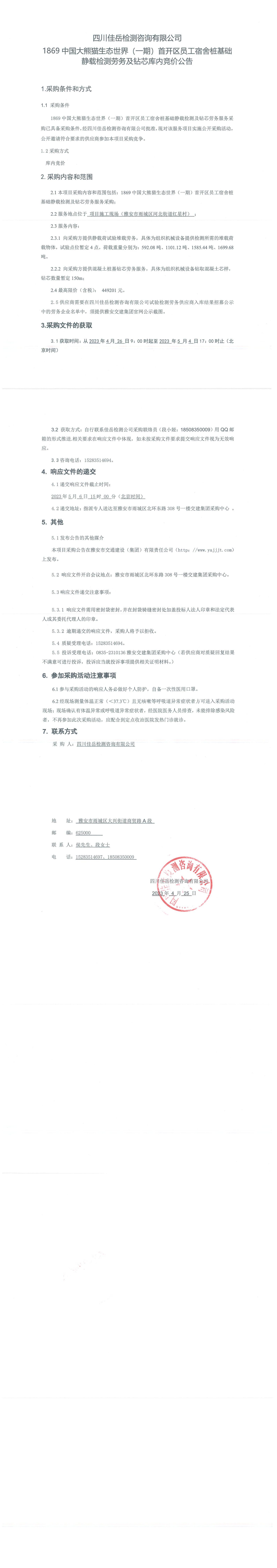 四川佳岳檢測(cè)咨詢(xún)有限公司1869中國(guó)大熊貓生態(tài)世界(一期)首開(kāi)區(qū)員工宿舍樁基礎(chǔ)靜載檢測(cè)勞務(wù)及磚芯庫(kù)內(nèi)競(jìng)價(jià)公告