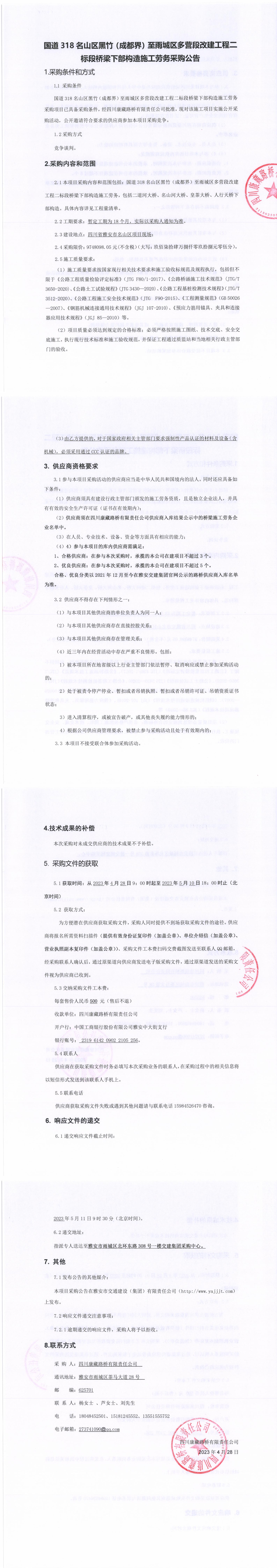 四川康藏路橋有限責(zé)任公司國(guó)道318名山區(qū)黑竹(成都界)至雨城區(qū)多營(yíng)段改建工程二標(biāo)段橋梁下部構(gòu)造施工勞務(wù)采購(gòu)公告