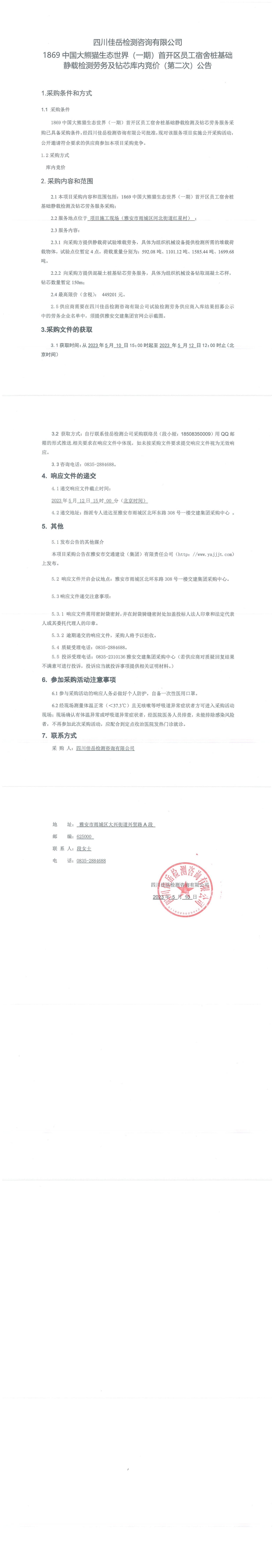 四川佳岳檢測(cè)咨詢有限公司1869中國(guó)大熊貓生態(tài)世界(一期)首開區(qū)員工宿舍樁基礎(chǔ)靜載檢測(cè)勞務(wù)及磚芯庫內(nèi)競(jìng)價(jià)(第二次)采購公告