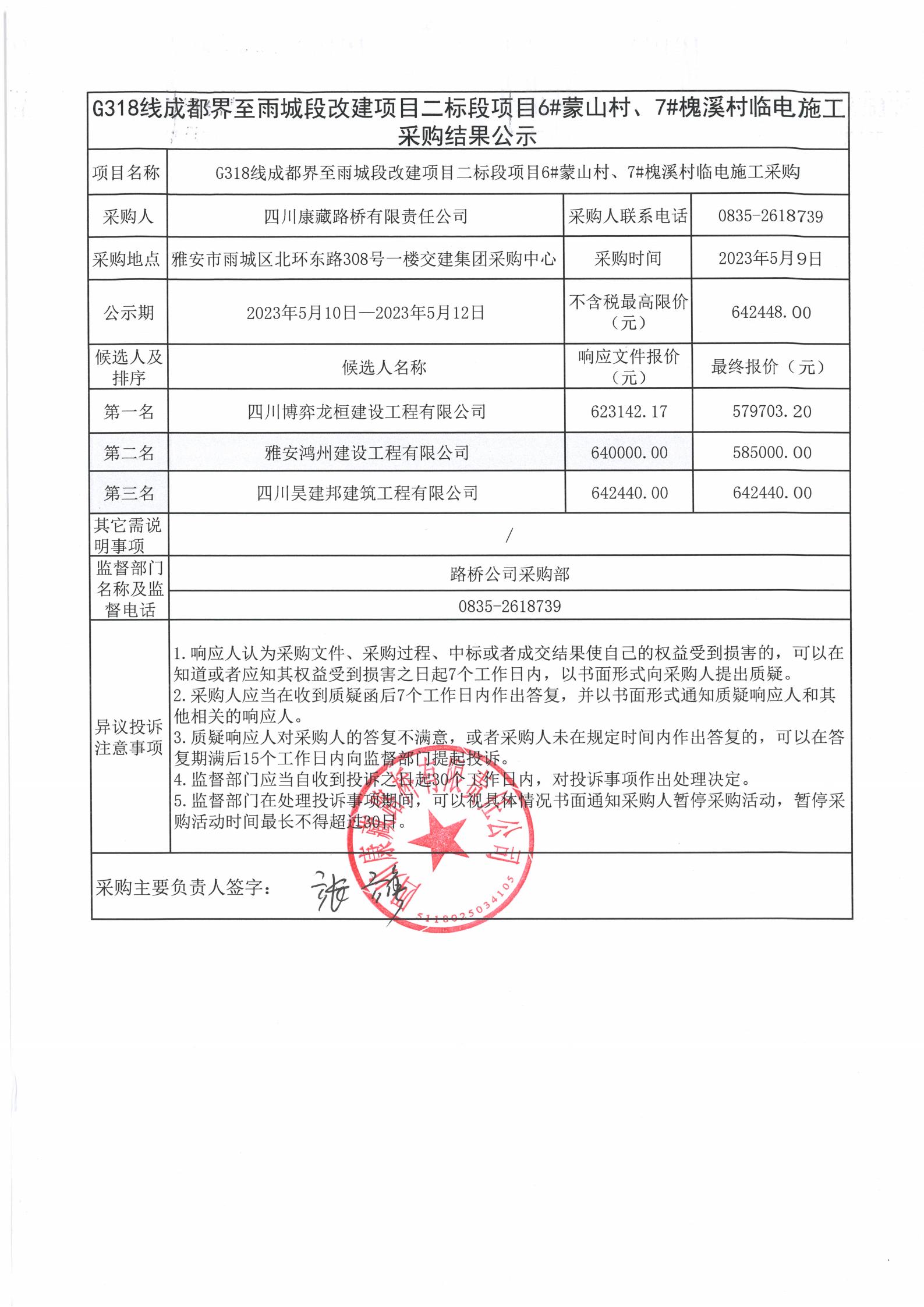 四川康藏路橋有限責(zé)任公司G318線成都至雨城段改建項(xiàng)目二標(biāo)段項(xiàng)目6#蒙山村、7#槐溪村臨時(shí)電施工采購(gòu)結(jié)果公示