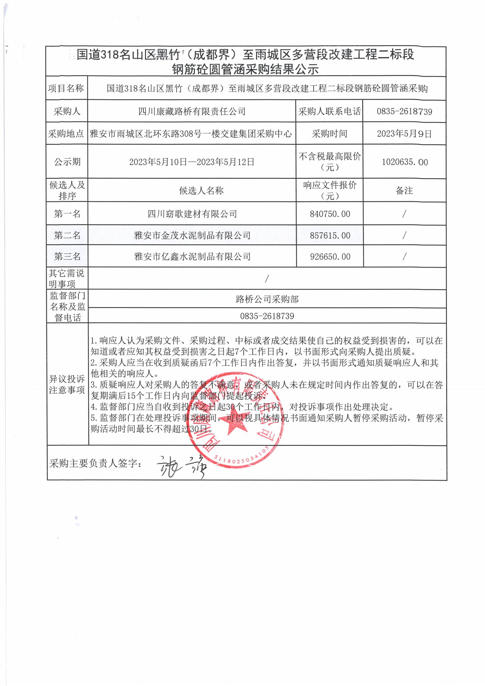 四川康藏路橋有限責任公司國道318名山區(qū)黑竹(成都界)至雨城區(qū)多營段改建工程二標段鋼筋砼圓管涵采購結果公示