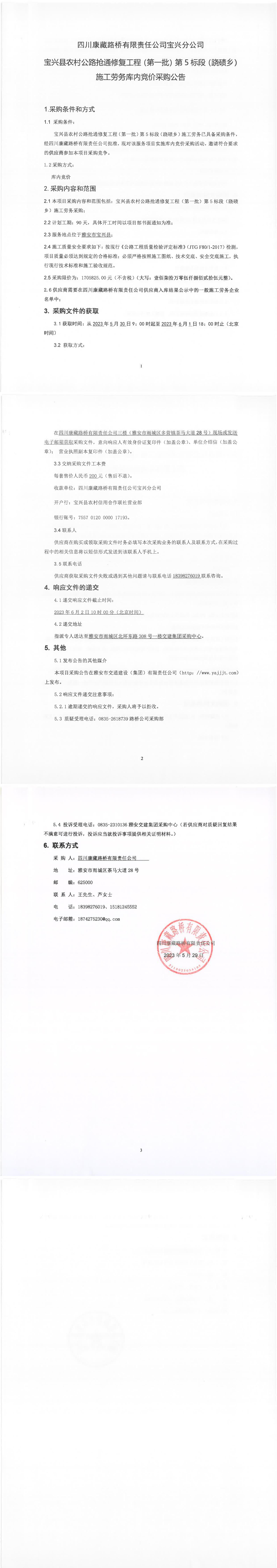 四川康藏路橋有限責任公司寶興農(nóng)村公路搶通修復工程(第一批)第5標段(蹺磧鄉(xiāng))施工勞務庫內(nèi)競價采購公告