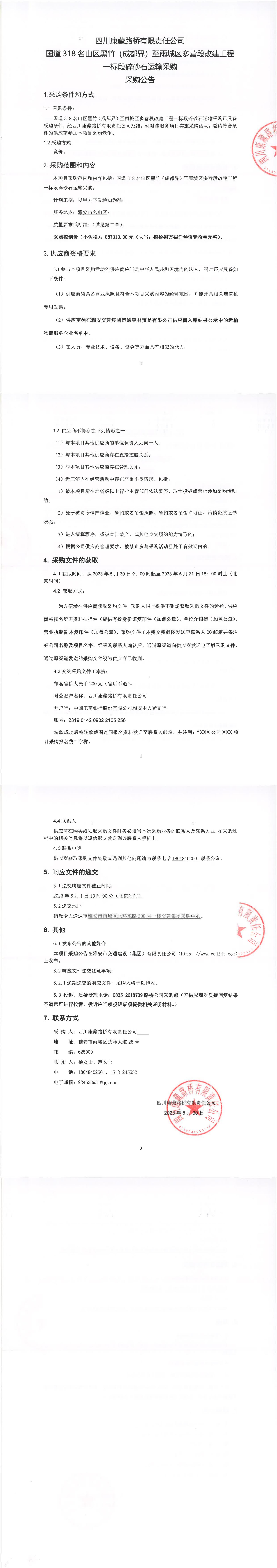 四川康藏路橋有限責(zé)任公司國道318名山區(qū)黑竹(成都界)至雨城區(qū)多營段改建工程一標段碎砂石運輸采購補遺書(一)