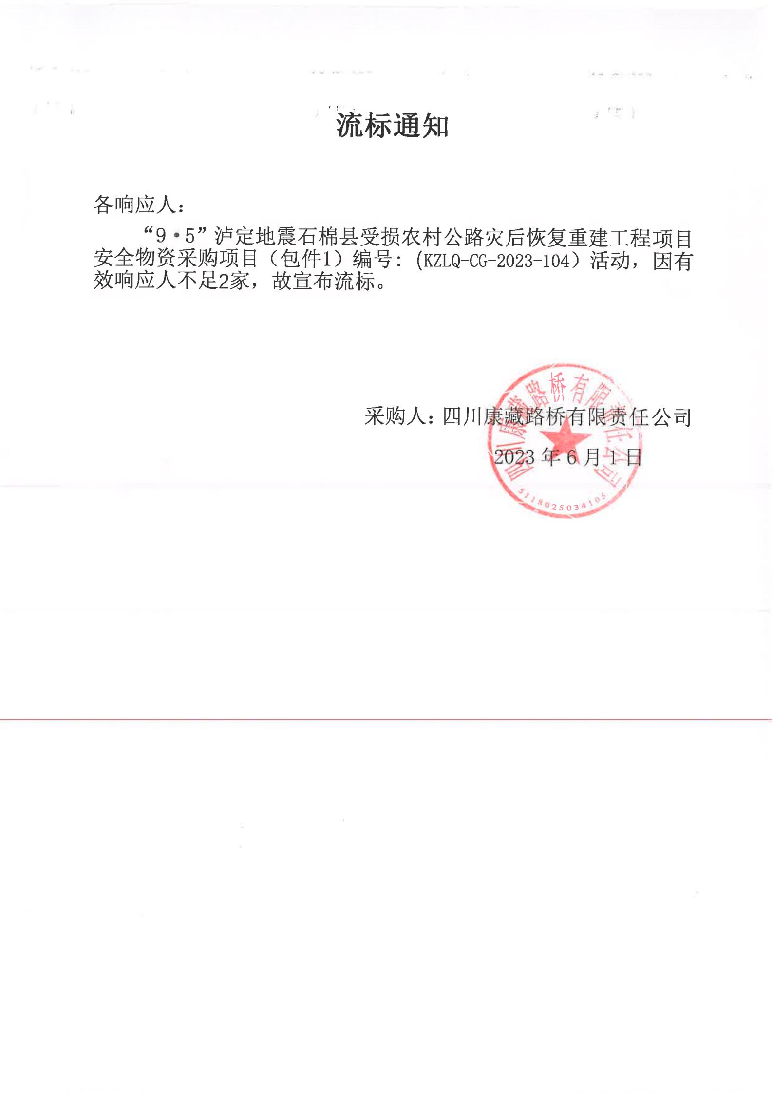 四川康藏路橋有限責任公司“9·5”瀘定地震石棉縣受損農村公路災后恢復重建工程項目安全物資項目(包件1)流標通知