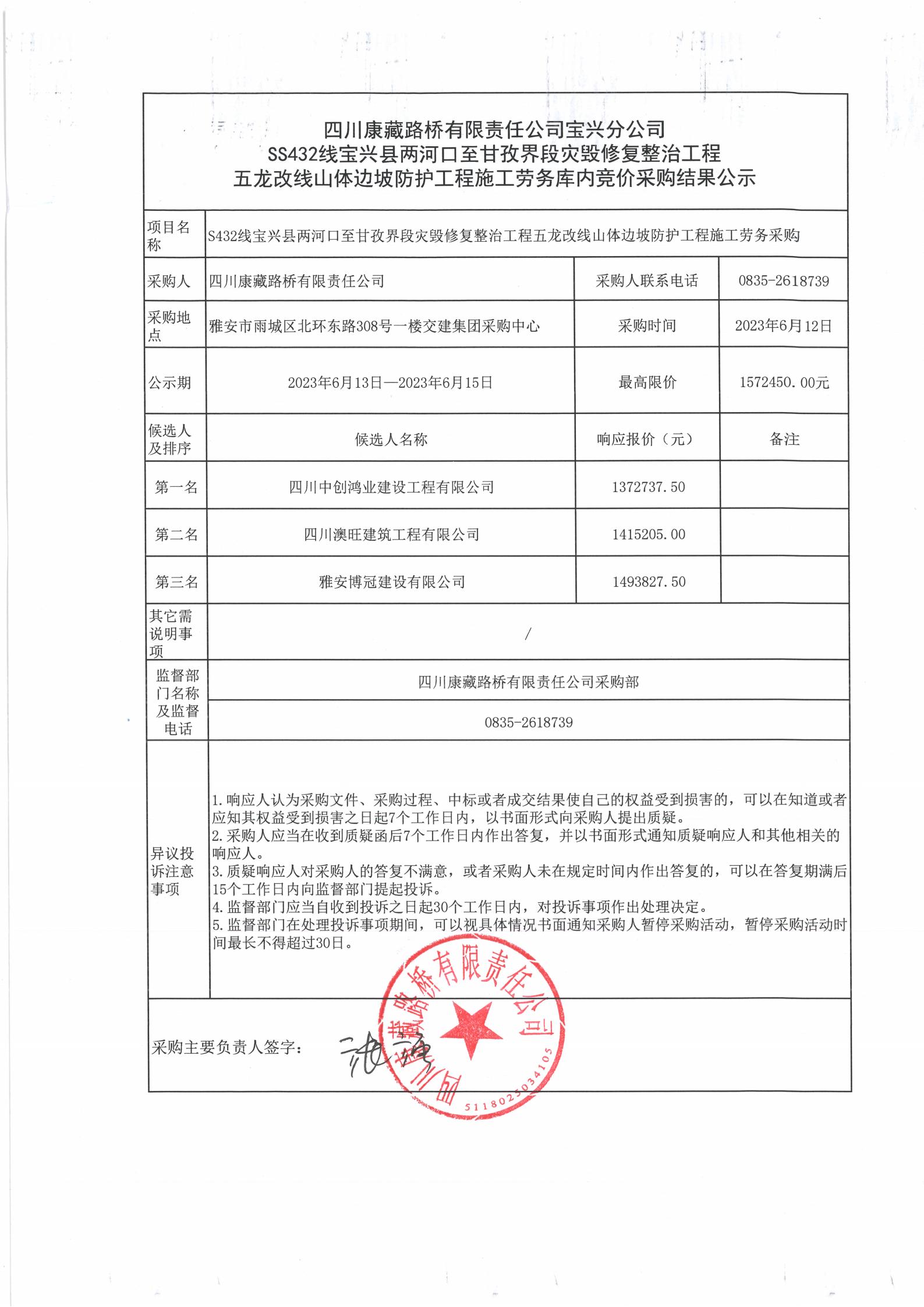 四川康藏路橋有限責(zé)任公司S432線寶興縣兩河口至甘孜界段災(zāi)毀修復(fù)整治工程五龍改線山體邊坡防護施工勞務(wù)庫內(nèi)競價采購結(jié)果公示