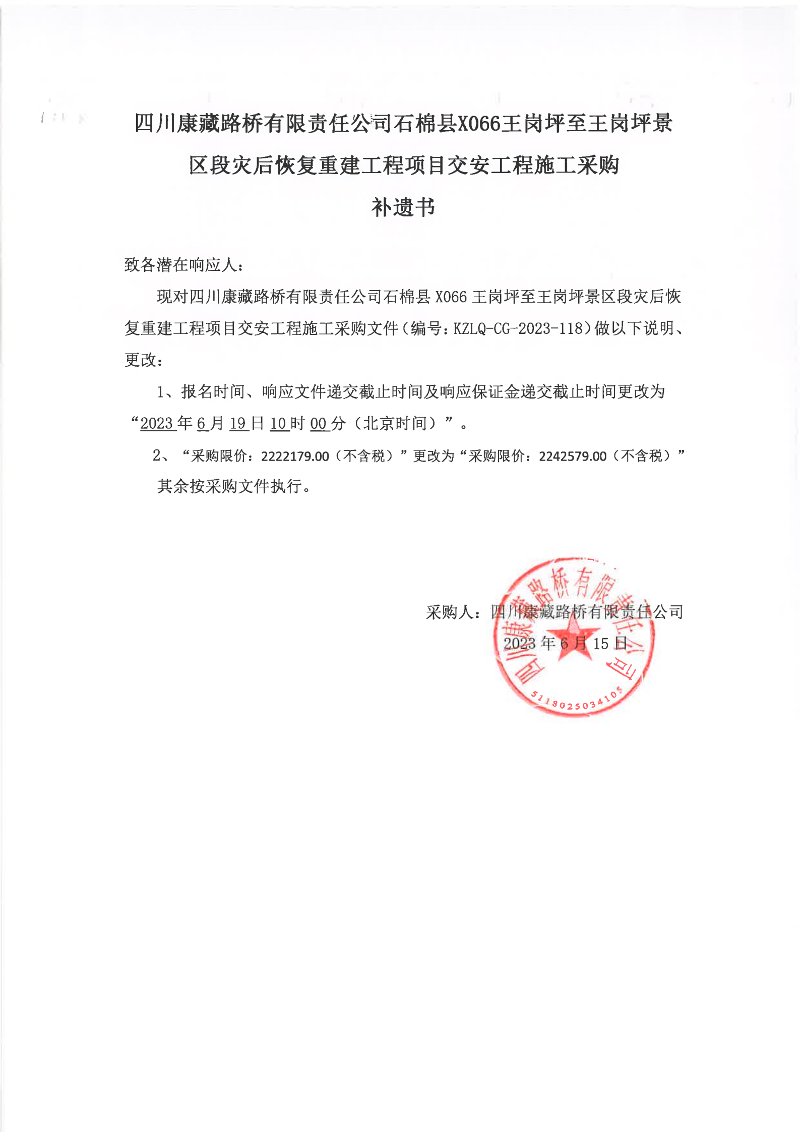四川康藏路橋有限責(zé)任公司石棉縣X066王崗坪至王崗坪景區(qū)段災(zāi)后恢復(fù)重建工程項(xiàng)目交安工程施工補(bǔ)遺書
