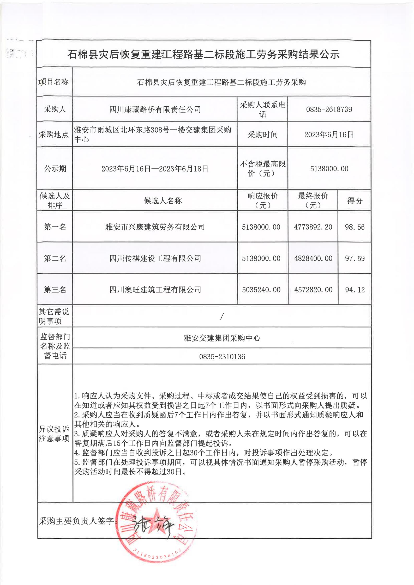 四川康藏路橋有限責任公司石棉縣災后恢復重建工程路基二標段施工勞務采購結果公示