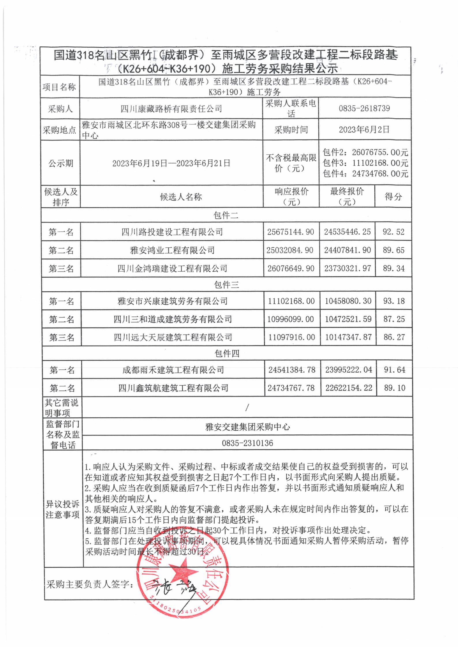 四川康藏路橋有限責任公司國道318名山區(qū)黑竹(成都界)至雨城區(qū)多營段改建工程二標段路基(K26+604-K36+190)施工勞務(wù)采購(包件二、包件三、包件四)結(jié)果公示