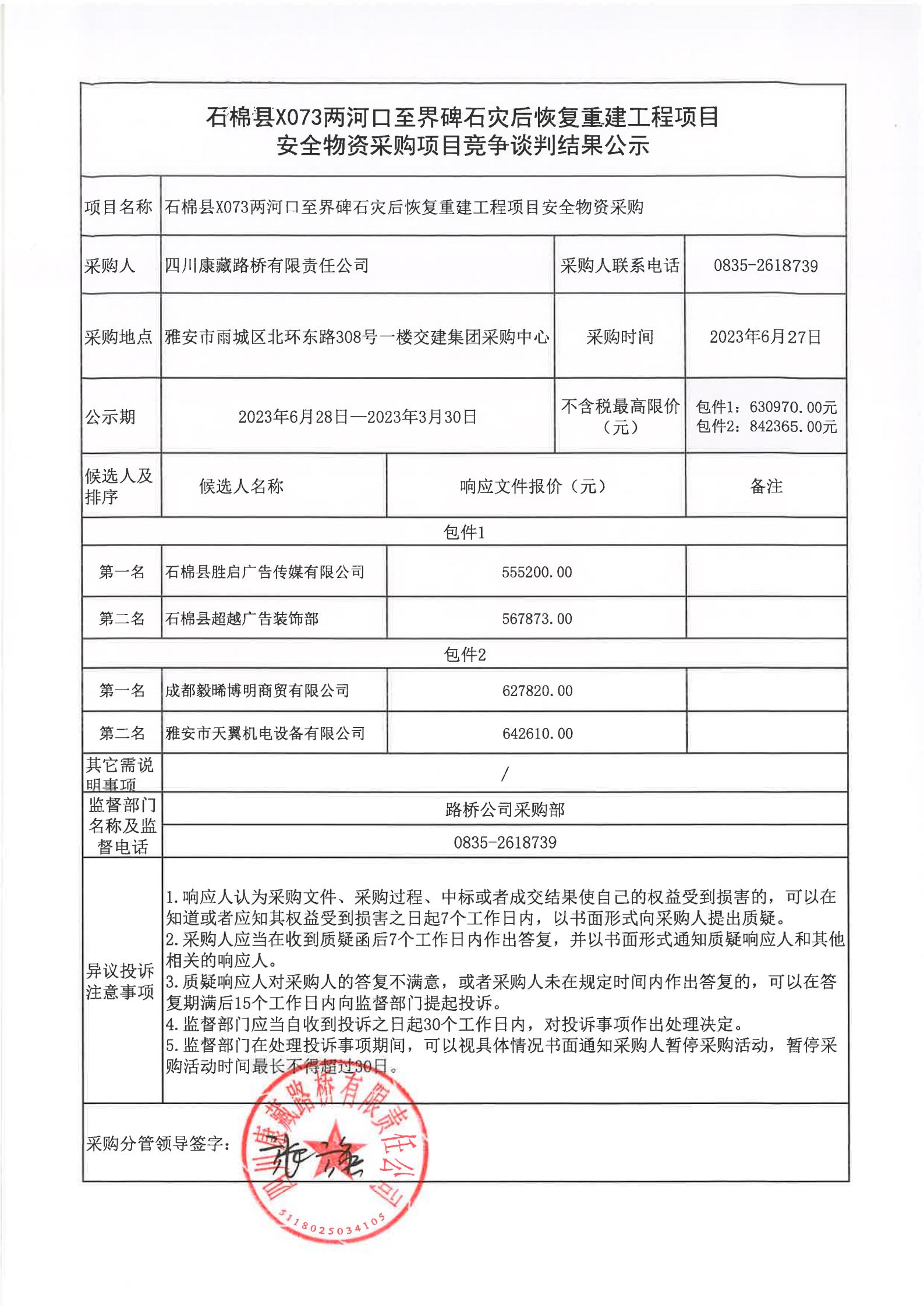 四川康藏路橋有限責(zé)任公司石棉縣X073兩河口至界碑石災(zāi)后恢復(fù)重建工程項目安全物資采購項目競爭談判結(jié)果公示